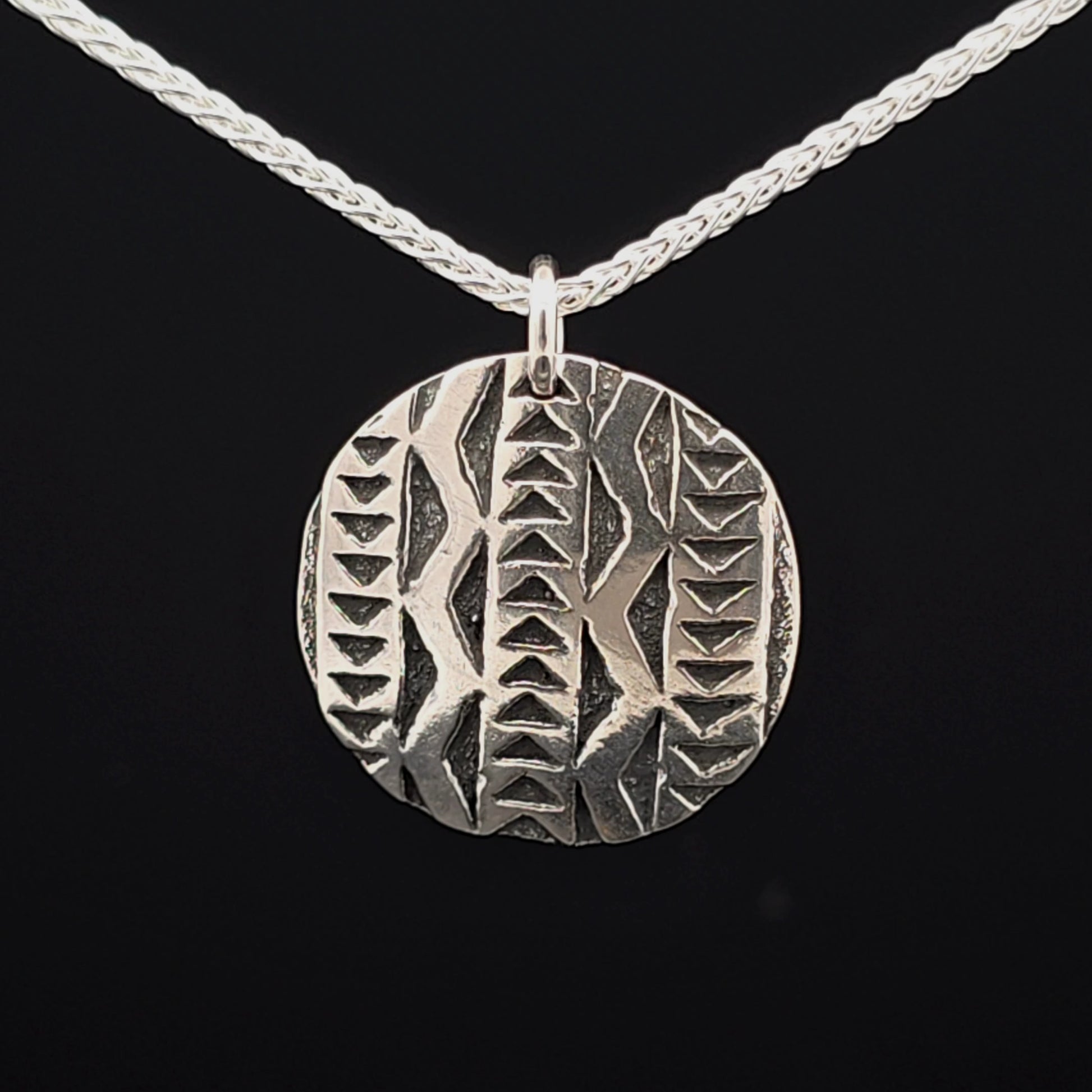 The Sterling Silver pendant features a traditional Mountain Sturgeon Path design. Sterling Silver Pendant on a 20" Sterling Silver Chain.